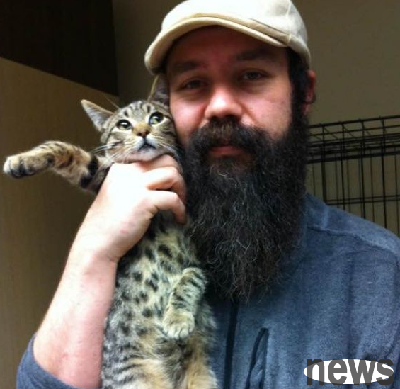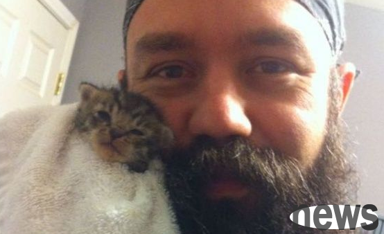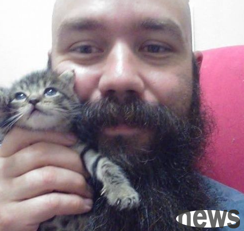 A foreign man with a warm beard who loves cats often rescues cats. He likes to compare the length of his beard with the cats. Whenever he sees the length of the kitten's body longer than his own beard, he will have a look of pride on his face!