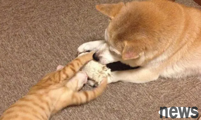 When a dog is unwell and whining, the cat will lick its fur to comfort it, and will also cuddle up next to it when sleeping. When the owner feeds the dog, the dog will stare at it and occasionally take a few bites.