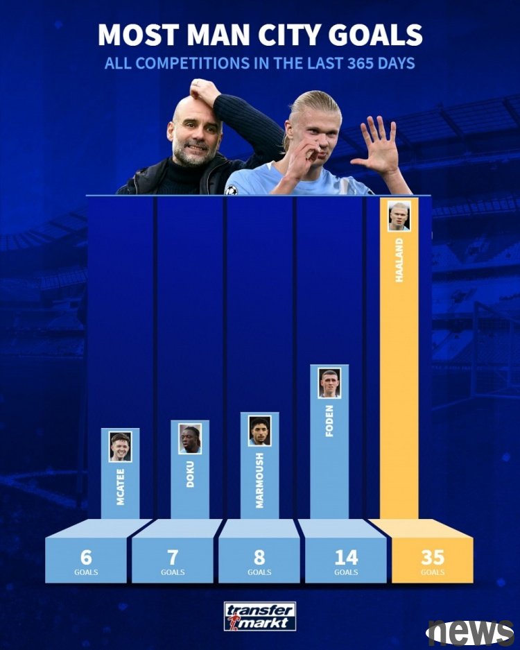 The German transfer market lists Manchester City's scorers in the past year, with Haaland ranked first in the 35-goal gap.