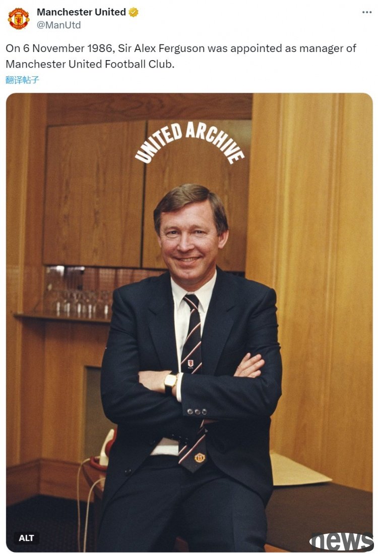 1986年11月6日,弗格森被任命为曼联主帅,曼联官方社媒晒出弗格森的照片,纪念这个特别的日子。