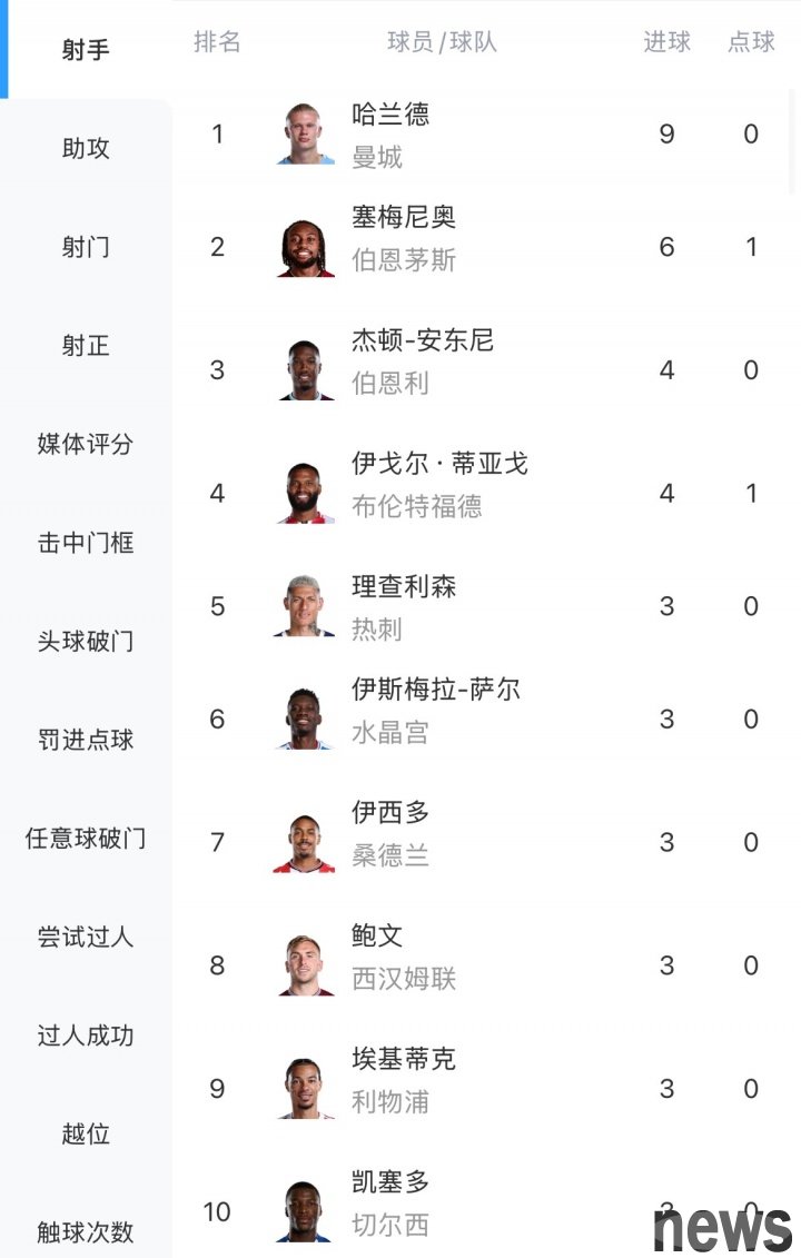 Since the new season, Haaland has scored 9 goals in 7 Premier League games, leading the scorer list. Semenho is also in good shape, scoring 5 goals and ranking second for the time being.