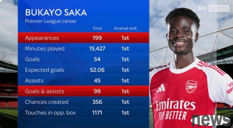 Saka will usher in a milestone in 200 Premier League games. Sky Sports has counted the Premier League data since Saka's debut. His appearances, goals, assists and other data are the first in Arsenal in the same period.