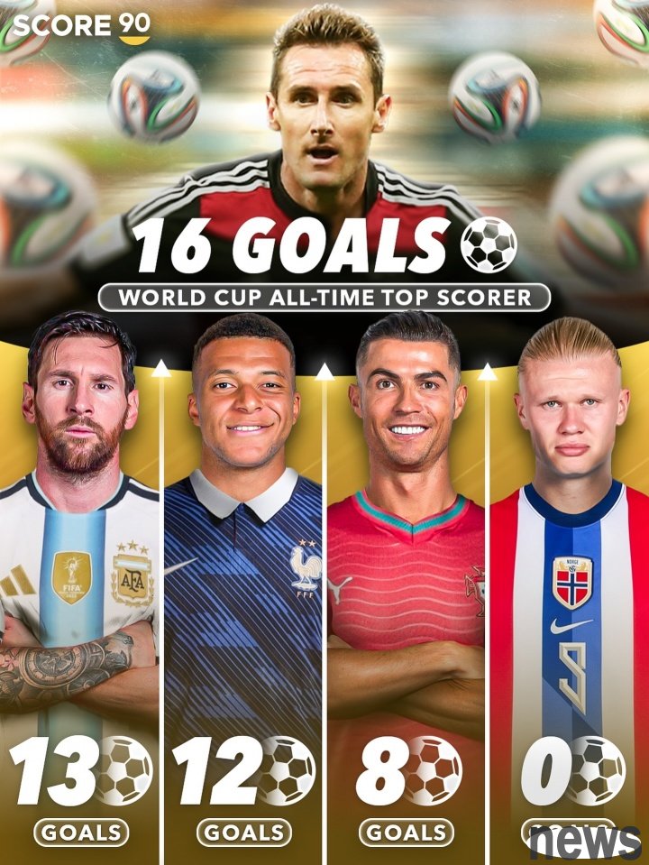 The current top scorer in World Cup history is Klose. He scored 16 goals in the 4 World Cups he participated in with the German team, surpassing Ronaldo who scored 15 goals. Among the active players, Messi, who has scored 13 goals, and Mbappe, who has scored 12 goals, have a chance to surpass Klose in next year's World Cup. However, Kane, Ronaldo, and Neymar, who have scored 8 goals, will be more difficult.